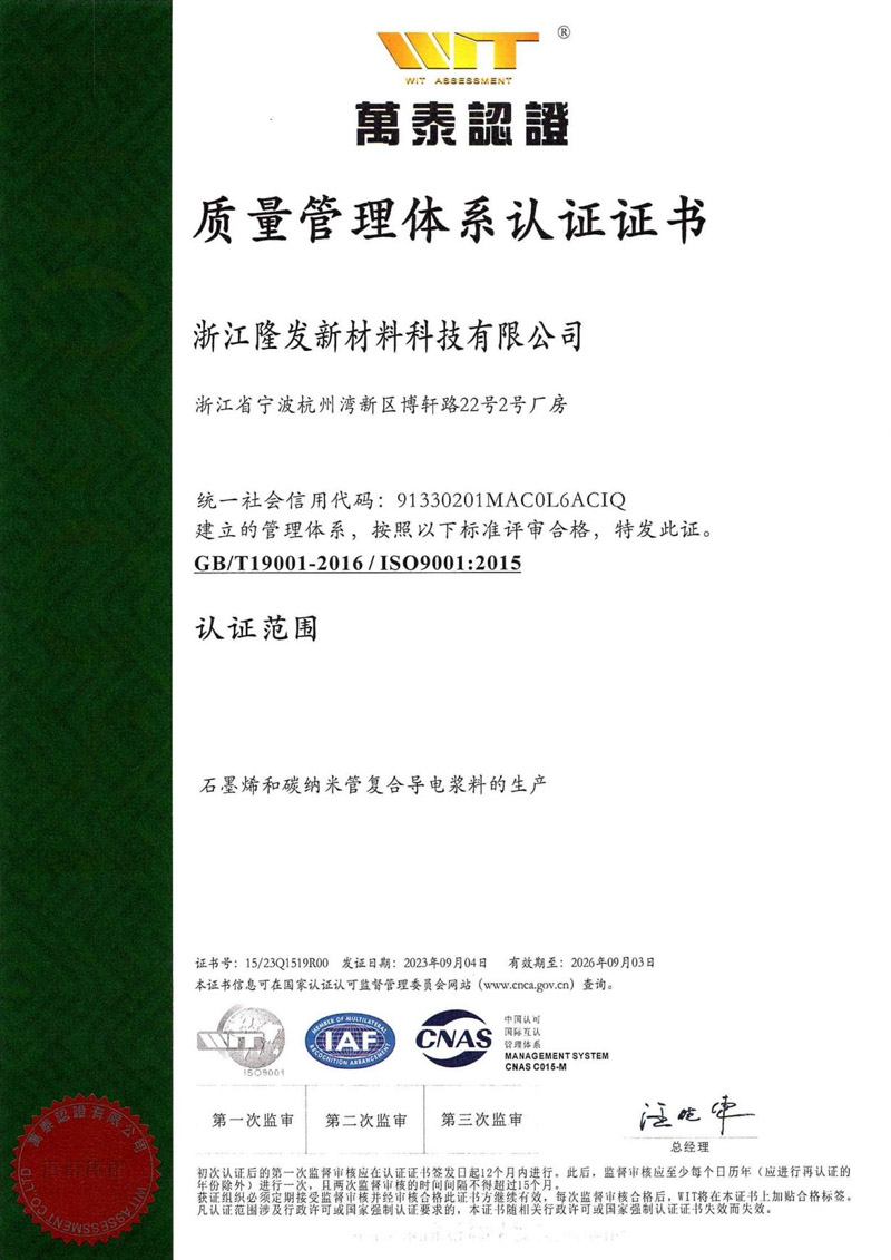 2023年9月4日,浙江隆发新材料科技有限公司荣获《质量管理体系认证证书》(证书编号:15/23Q1519R00)。这标志着隆发各项生产管理和服务工作全面与国际管理接轨,标志着隆发建立的质量管理体系符合GB/T19001-2016/ISO9001:2015标准,在各项管理系统整合上已达到国际标准!